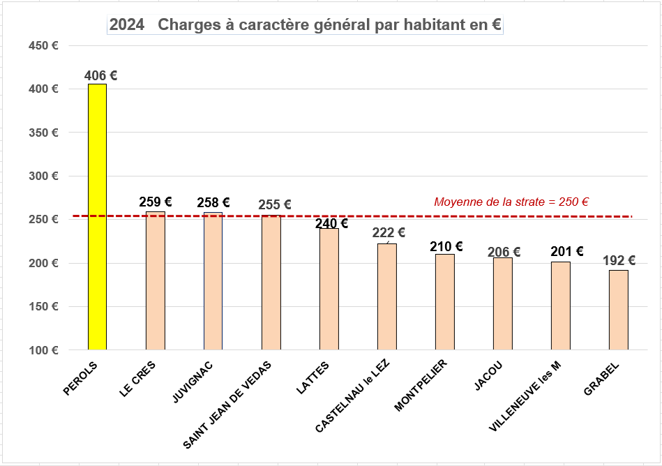 Comparaison entre les charges à caractère général par habitant de l’année 2024 à Pérols et celles du Crès. (même année)